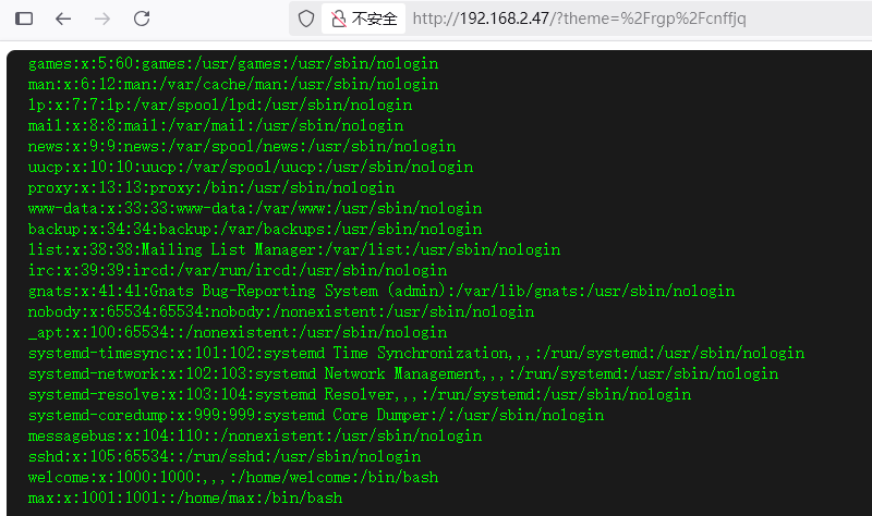尝试将/etc/passwd编码后,进行输入,发现能够成功读取文件,同时发现两个用户welcome,max