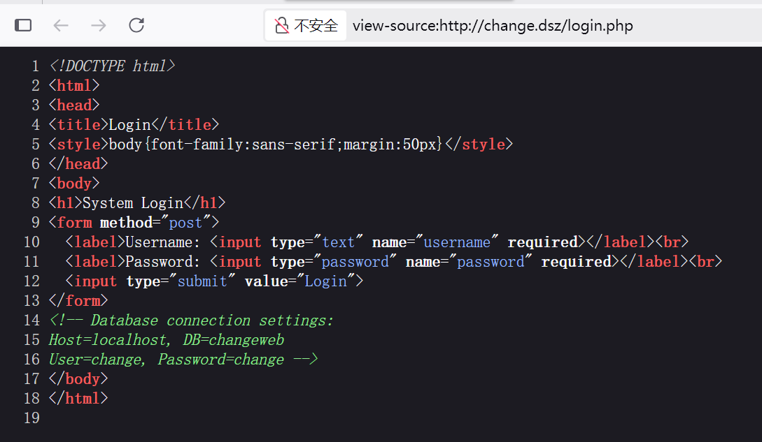 查看页面源码,找到数据库的登录信息