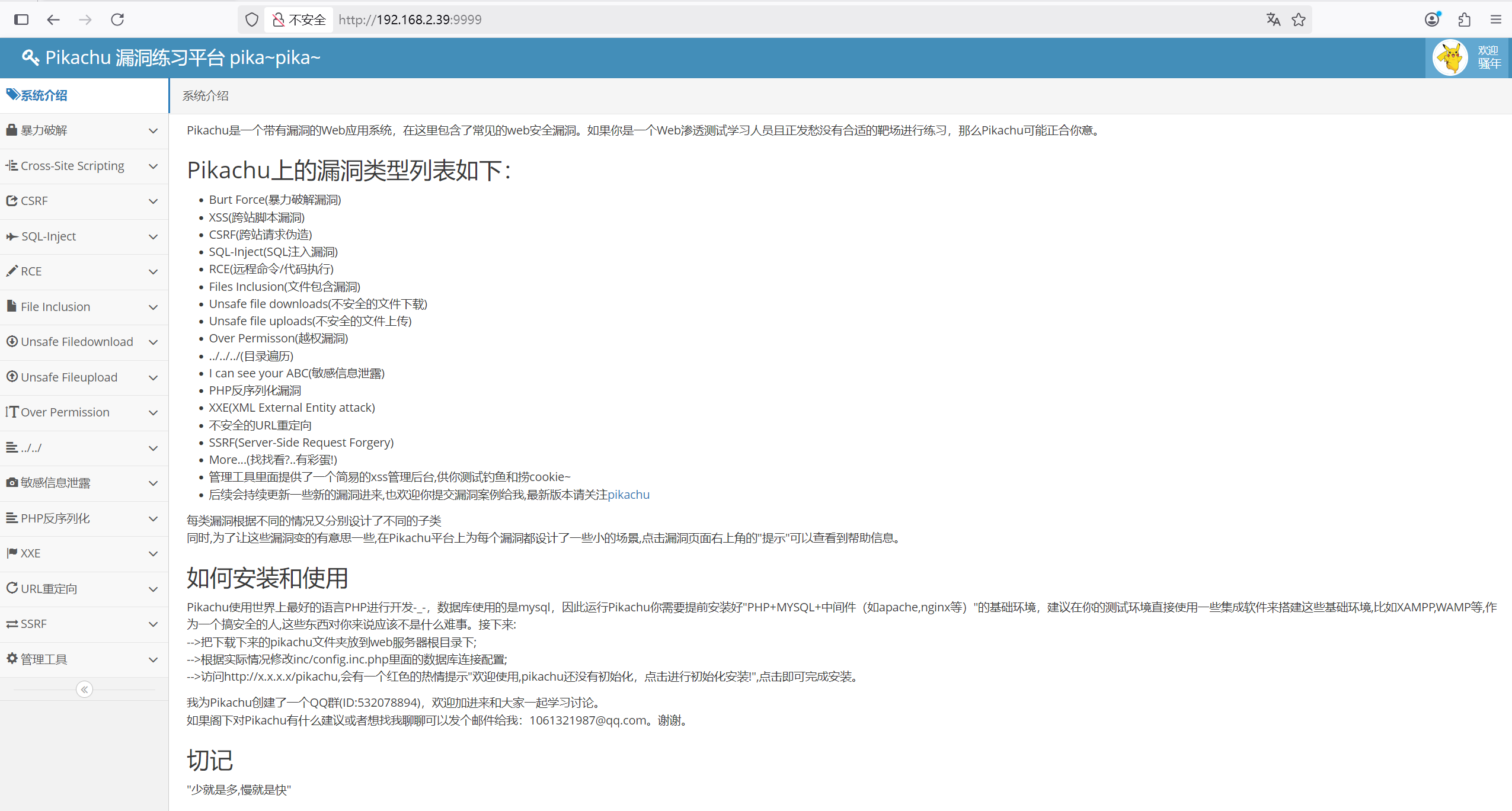 PORT STATE SERVICE VERSION 22/tcp open ssh OpenSSH 8.4p1 Debian 5+deb11u3 (protocol 2.0) | ssh-hostkey: | 3072 f6:a3:b6:78:c4:62:af:44:bb:1a:a0:0c:08:6b:98:f7 (RSA) | 256 bb:e8:a2:31:d4:05:a9:c9:31:ff:62:f6:32:84:21:9d (ECDSA) |_ 256 3b:ae:34:64:4f:a5:75:b9:4a:b9:81:f9:89:76:99:eb (ED25519) 80/tcp open http Apache httpd 2.4.62 ((Debian)) |_http-server-header: Apache/2.4.62 (Debian) |_http-title: Site doesnt have a title (text/html). 9999/tcp open http Apache httpd 2.4.29 ((Ubuntu)) | http-git: | 192.168.2.39:9999/.git/ | Git repository found! | Repository description: Unnamed repository; edit this file 'description' to name the... | Remotes: |_ https://github.com/zhuifengshaonianhanlu/pikachu.git | http-cookie-flags: | /: | PHPSESSID: |_ httponly flag not set |_http-title: Get the pikachu |_http-server-header: Apache/2.4.29 (Ubuntu) MAC Address: 08:00:27:B7:8E:39 (Oracle VirtualBox virtual NIC) Warning: OSScan results may be unreliable because we could not find at least 1 open and 1 closed port Device type: general purpose Running: Linux 4.X|5.X OS CPE: cpe:/o:linux:linux_kernel:4 cpe:/o:linux:linux_kernel:5 OS details: Linux 4.15 - 5.8, Linux 5.0 - 5.4 Network Distance: 1 hop Service Info: OS: Linux; CPE: cpe:/o:linux:linux_kernel