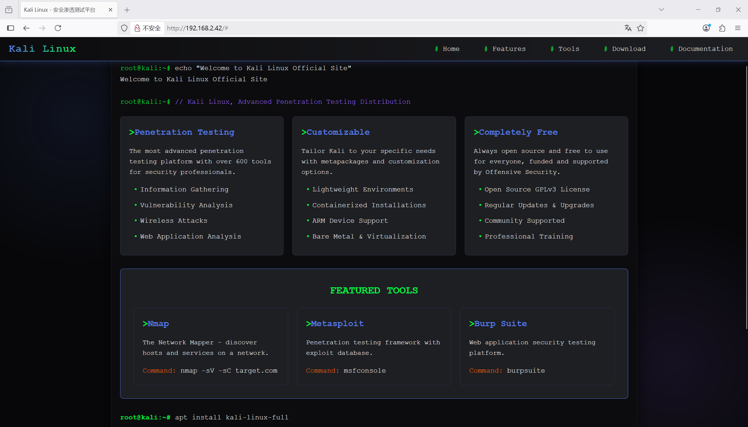 PORT STATE SERVICE VERSION 22/tcp open ssh OpenSSH 8.4p1 Debian 5+deb11u3 (protocol 2.0) | ssh-hostkey: | 3072 f6:a3:b6:78:c4:62:af:44:bb:1a:a0:0c:08:6b:98:f7 (RSA) | 256 bb:e8:a2:31:d4:05:a9:c9:31:ff:62:f6:32:84:21:9d (ECDSA) |_ 256 3b:ae:34:64:4f:a5:75:b9:4a:b9:81:f9:89:76:99:eb (ED25519) 80/tcp open http Apache httpd 2.4.62 ((Debian)) |_http-title: Kali Linux - \xE5\xAE\x89\xE5\x85\xA8\xE6\xB8\x97\xE9\x80\x8F\xE6\xB5\x8B\xE8\xAF\x95\xE5\xB9\xB3\xE5\x8F\xB0 |_http-server-header: Apache/2.4.62 (Debian) MAC Address: 08:00:27:A6:0D:F6 (Oracle VirtualBox virtual NIC) Warning: OSScan results may be unreliable because we could not find at least 1 open and 1 closed port Device type: general purpose Running: Linux 4.X|5.X OS CPE: cpe:/o:linux:linux_kernel:4 cpe:/o:linux:linux_kernel:5 OS details: Linux 4.15 - 5.8 Network Distance: 1 hop Service Info: OS: Linux; CPE: cpe:/o:linux:linux_kernel
