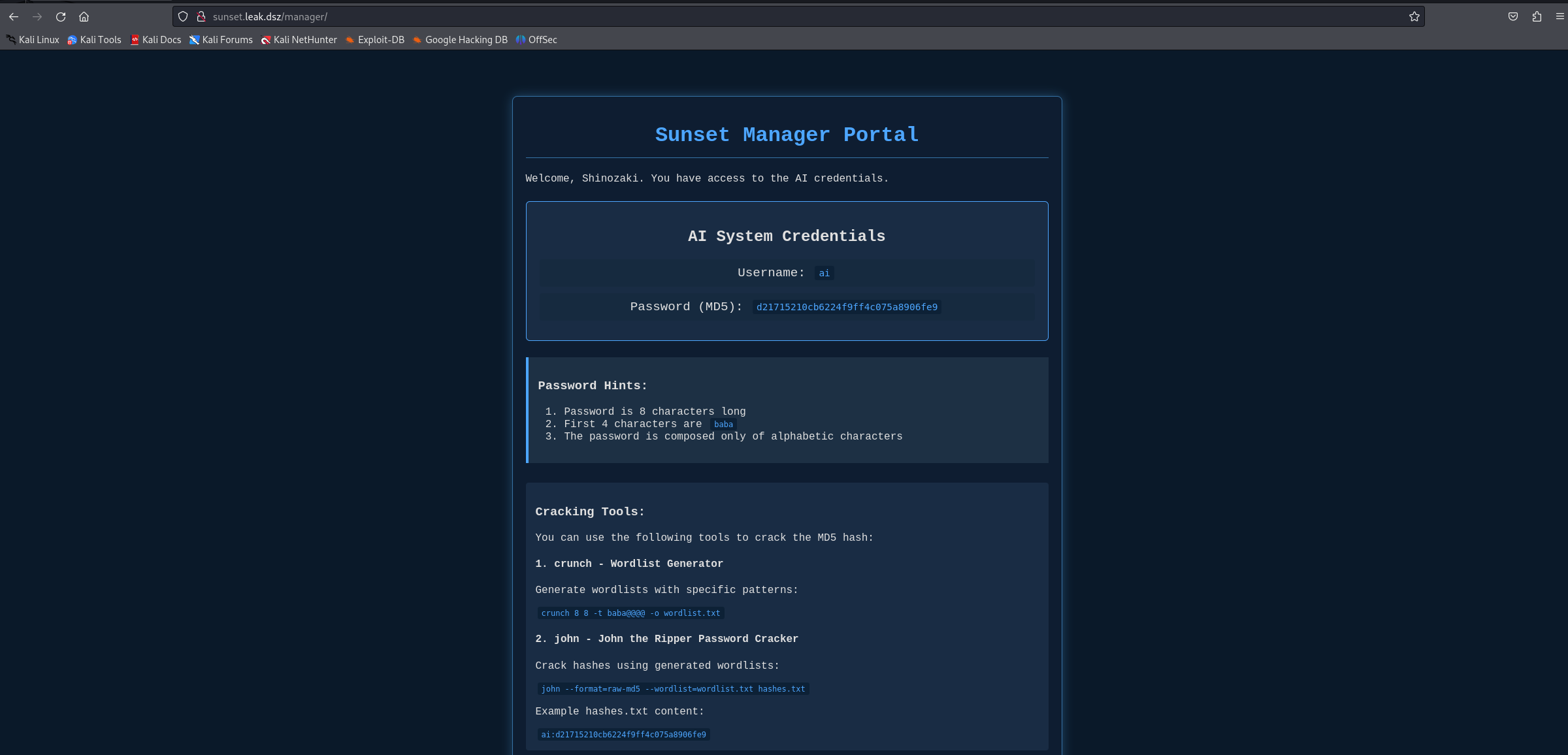┌──(root㉿kali)-[/tmp] └─# john --format=raw-md5 --wordlist=wordlist.txt hashes.txt Using default input encoding: UTF-8 Loaded 1 password hash (Raw-MD5 [MD5 128/128 AVX 4x3]) Warning: no OpenMP support for this hashtype, consider --fork=8 Press 'q' or Ctrl-C to abort, almost any other key for status babadawo (?) 1g 0:00:00:00 DONE (2025-07-01 19:33) 100.0g/s 5337Kp/s 5337Kc/s 5337KC/s babadaro..babadayx Use the "--show --format=Raw-MD5" options to display all of the cracked passwords reliably Session completed.