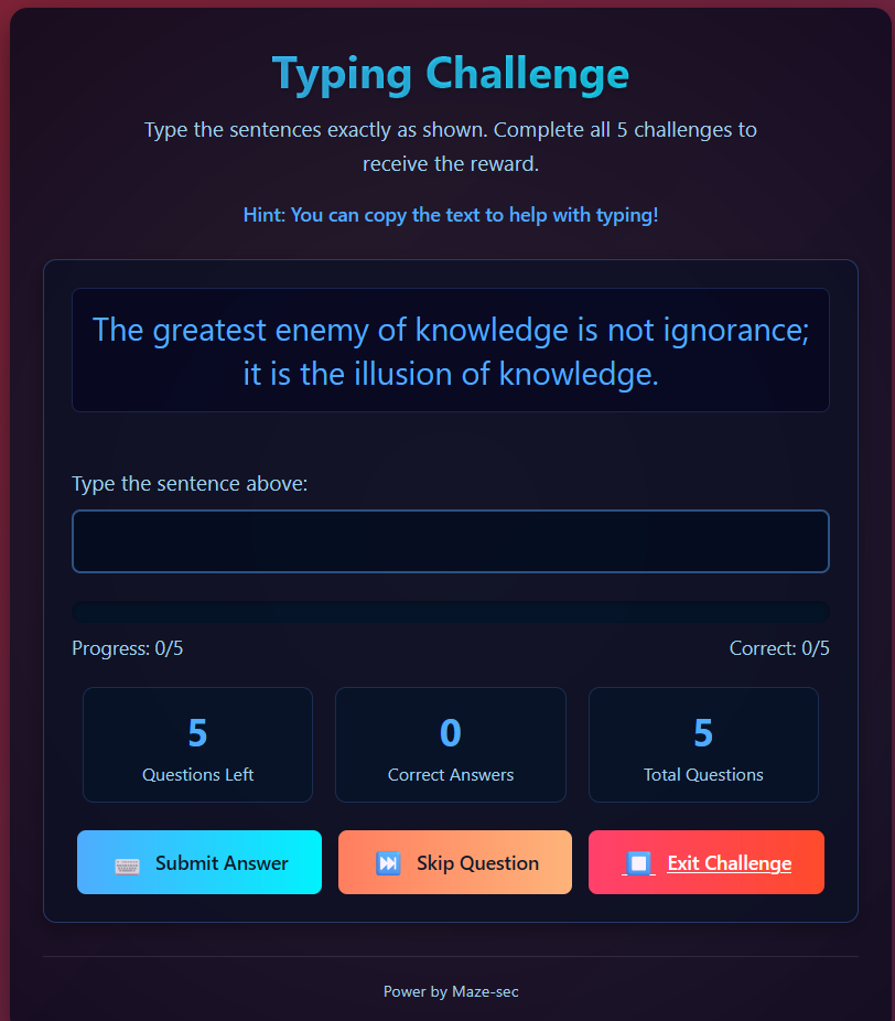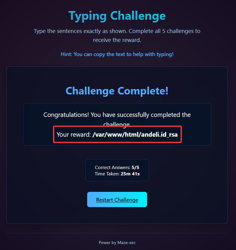 提示打字游戏,输入上面的文字,完成后有提示,根据步骤,完成上述的打字游戏,得到提示
