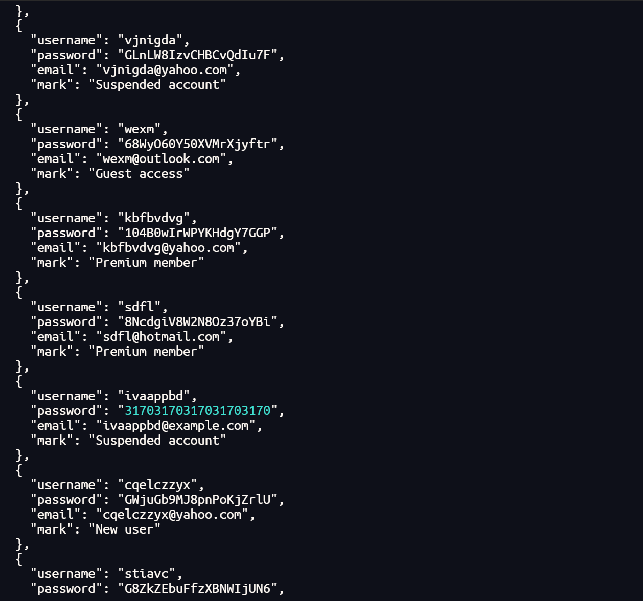 查看发现是一些用户名和密码,同时观察到有一串密码是有颜色的