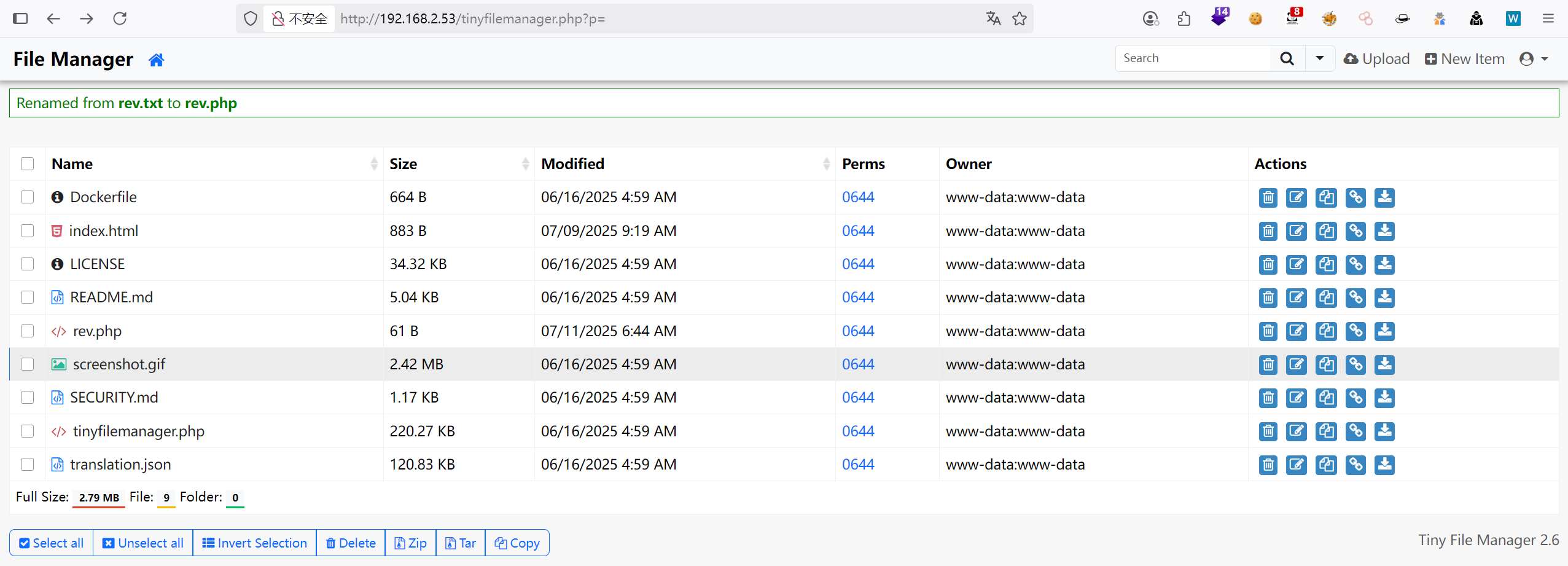 PORT STATE SERVICE VERSION 22/tcp open ssh OpenSSH 8.4p1 Debian 5+deb11u3 (protocol 2.0) | ssh-hostkey: | 3072 f6:a3:b6:78:c4:62:af:44:bb:1a:a0:0c:08:6b:98:f7 (RSA) | 256 bb:e8:a2:31:d4:05:a9:c9:31:ff:62:f6:32:84:21:9d (ECDSA) |_ 256 3b:ae:34:64:4f:a5:75:b9:4a:b9:81:f9:89:76:99:eb (ED25519) 80/tcp open http Apache httpd 2.4.62 ((Debian)) |_http-title: Redirecting to File Manager |_http-server-header: Apache/2.4.62 (Debian) MAC Address: 08:00:27:EF:1D:95 (Oracle VirtualBox virtual NIC) Warning: OSScan results may be unreliable because we could not find at least 1 open and 1 closed port Device type: general purpose Running: Linux 4.X|5.X OS CPE: cpe:/o:linux:linux_kernel:4 cpe:/o:linux:linux_kernel:5 OS details: Linux 4.15 - 5.8 Network Distance: 1 hop Service Info: OS: Linux; CPE: cpe:/o:linux:linux_kernel