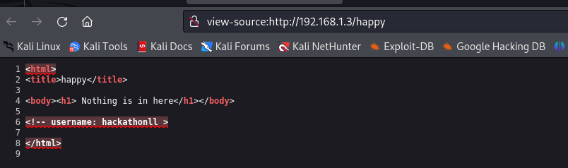 发现两个有用的目录,robots.txt和happy (3)依次访问,robots.txt中没有任何东西,happy中提示Nothing is in here,查看页面源码,找到一个username:hackathonll 80端口渗透基本结束
