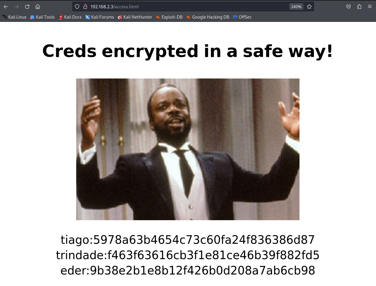 ┌──(kali㉿kali)-[/miao/vulnhub/Jarbas] └─$ sudo nmap -sn 192.168.2.0/24 Starting Nmap 7.94SVN ( https://nmap.org ) at 2025-02-05 09:07 EST Nmap scan report for 192.168.2.1 Host is up (0.00015s latency). MAC Address: 0A:00:27:00:00:52 (Unknown) Nmap scan report for 192.168.2.2 Host is up (0.00027s latency). MAC Address: 08:00:27:32:09:17 (Oracle VirtualBox virtual NIC) Nmap scan report for 192.168.2.3 Host is up (0.00072s latency). MAC Address: 08:00:27:42:06:E4 (Oracle VirtualBox virtual NIC) Nmap scan report for 192.168.2.4 Host is up. Nmap done: 256 IP addresses (4 hosts up) scanned in 2.00 seconds